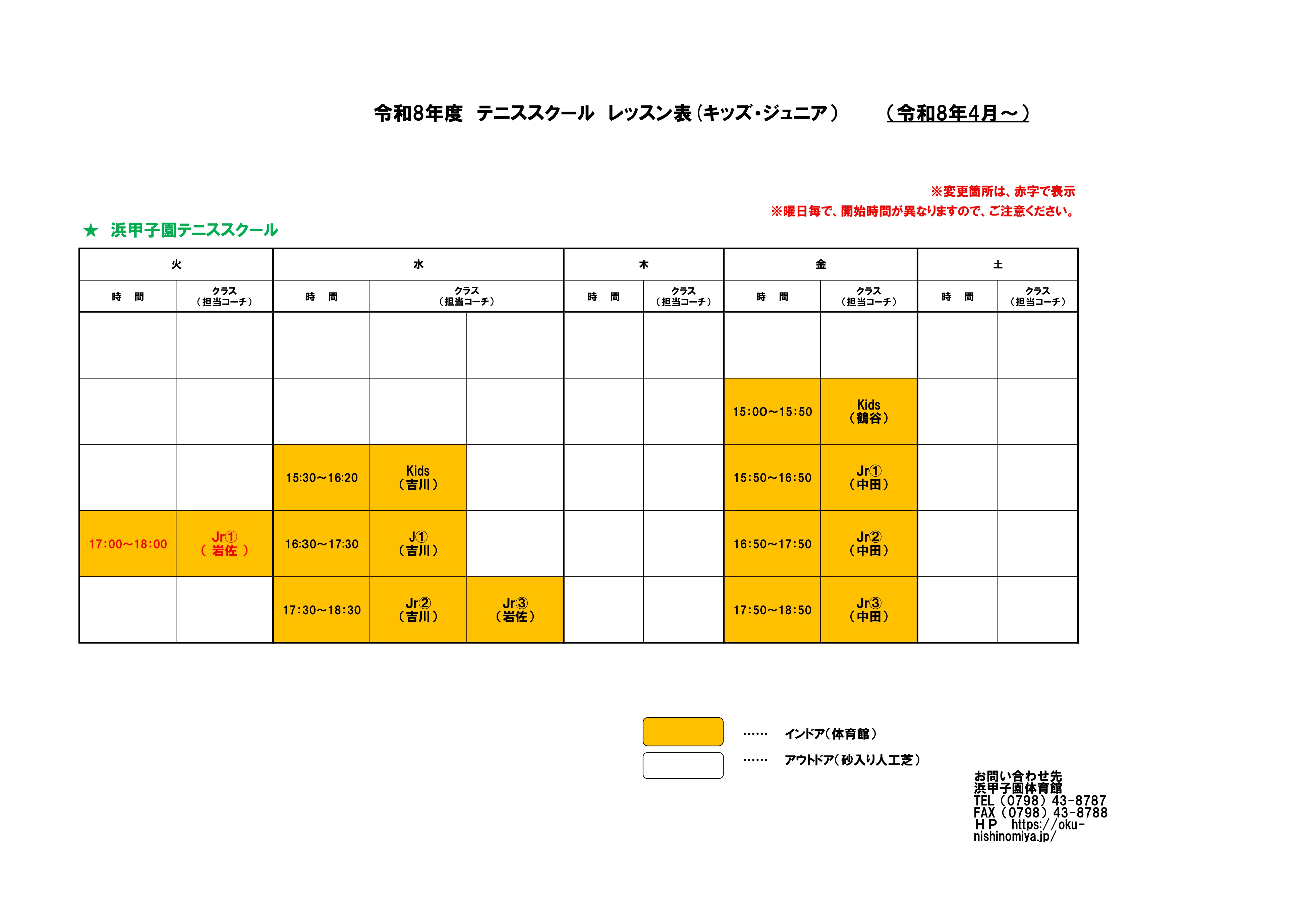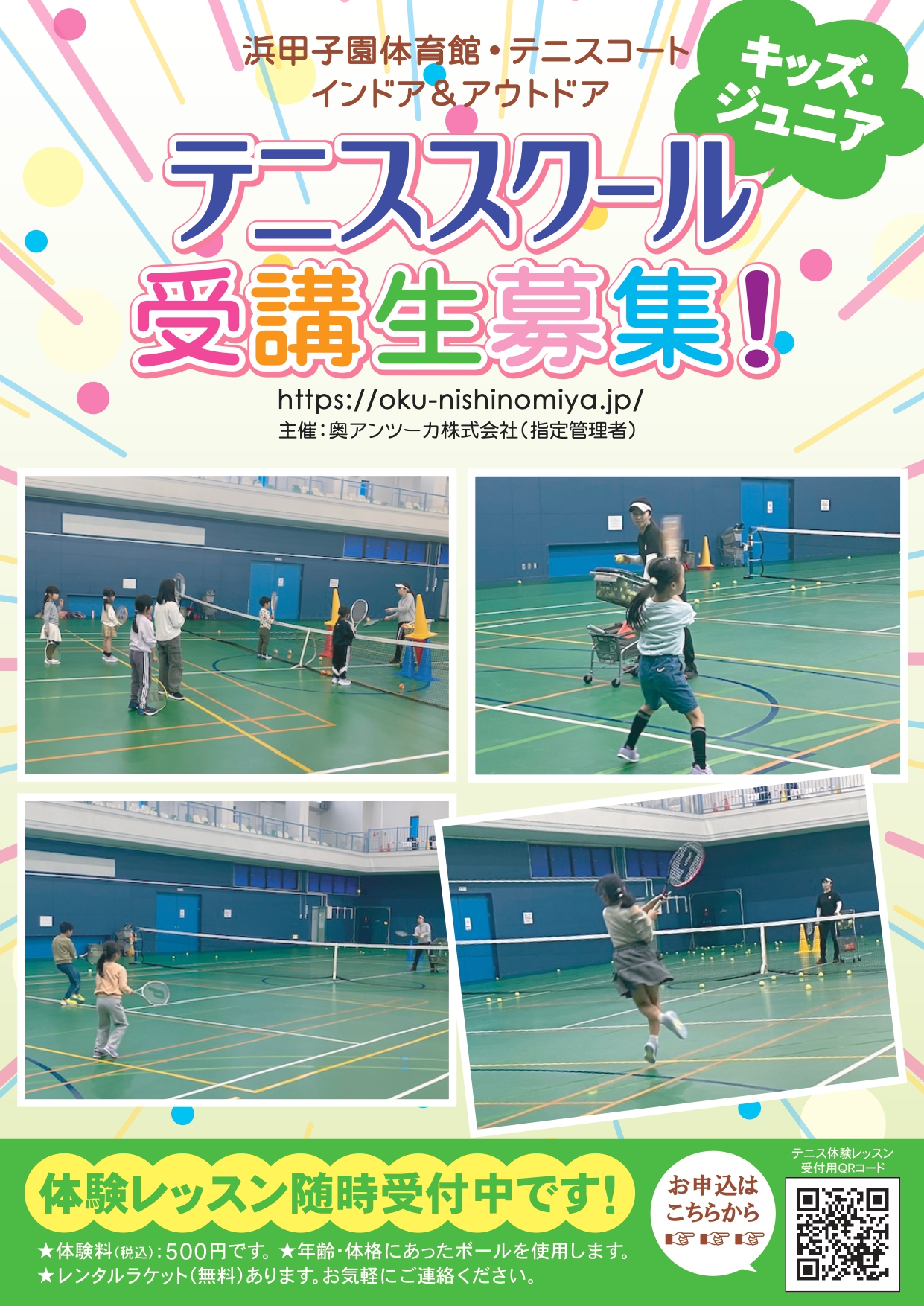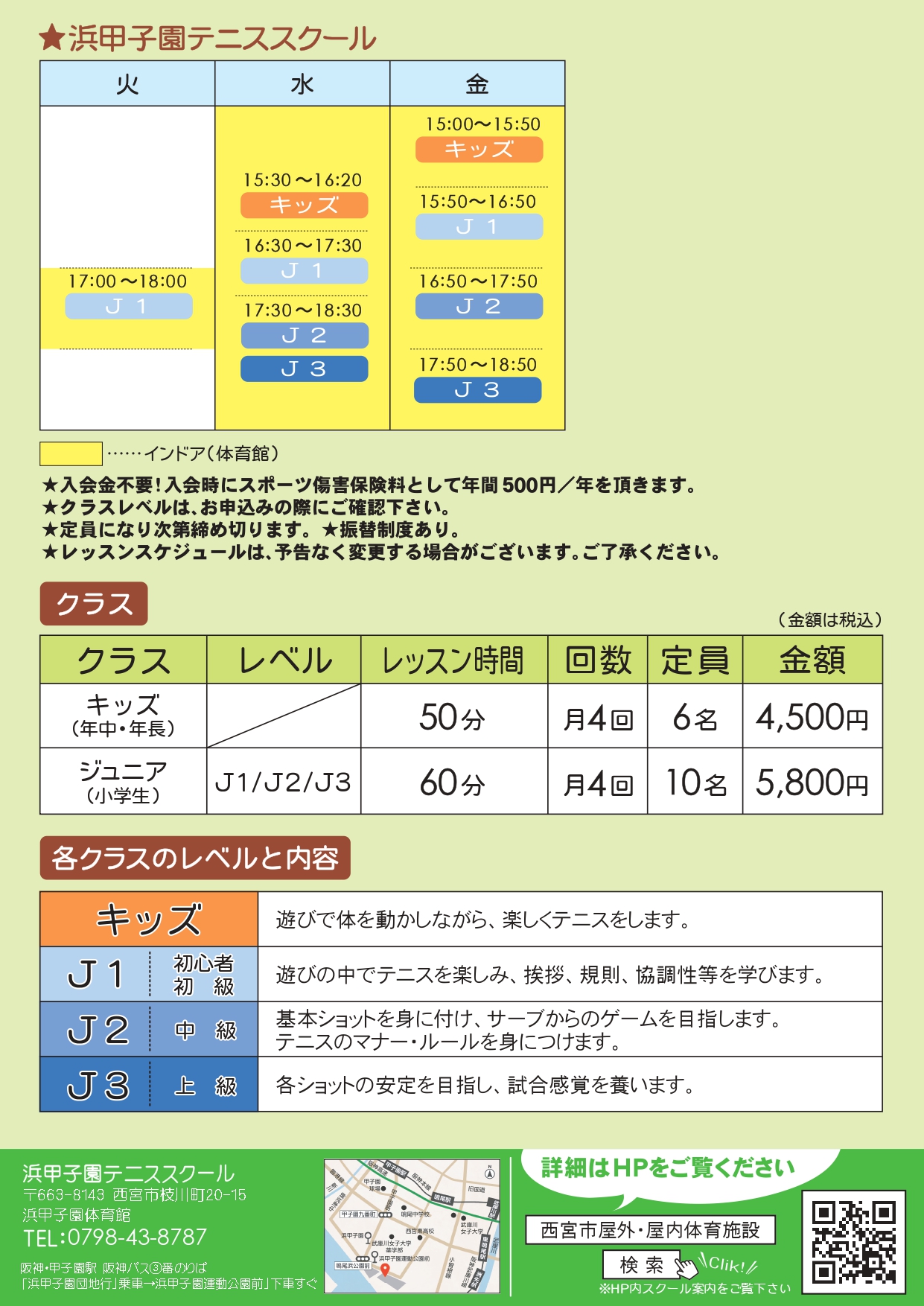 500 円/回迷った時がテニスの始め時!体験レッスンは随時受け付けています。 ※ 体験レッスン後、2ヶ月以内に入会していただくと 500円キャッシュバックいたします。 ※ ラケットレンタル有。(無料) ※ 運動の出来る服装(インドアの場合は室内用の運動シューズ)で お越しください。 ※ J1クラスを体験して頂きます。他のスクールの経験がある場合はJ1か J2クラスにご参加ください。 |