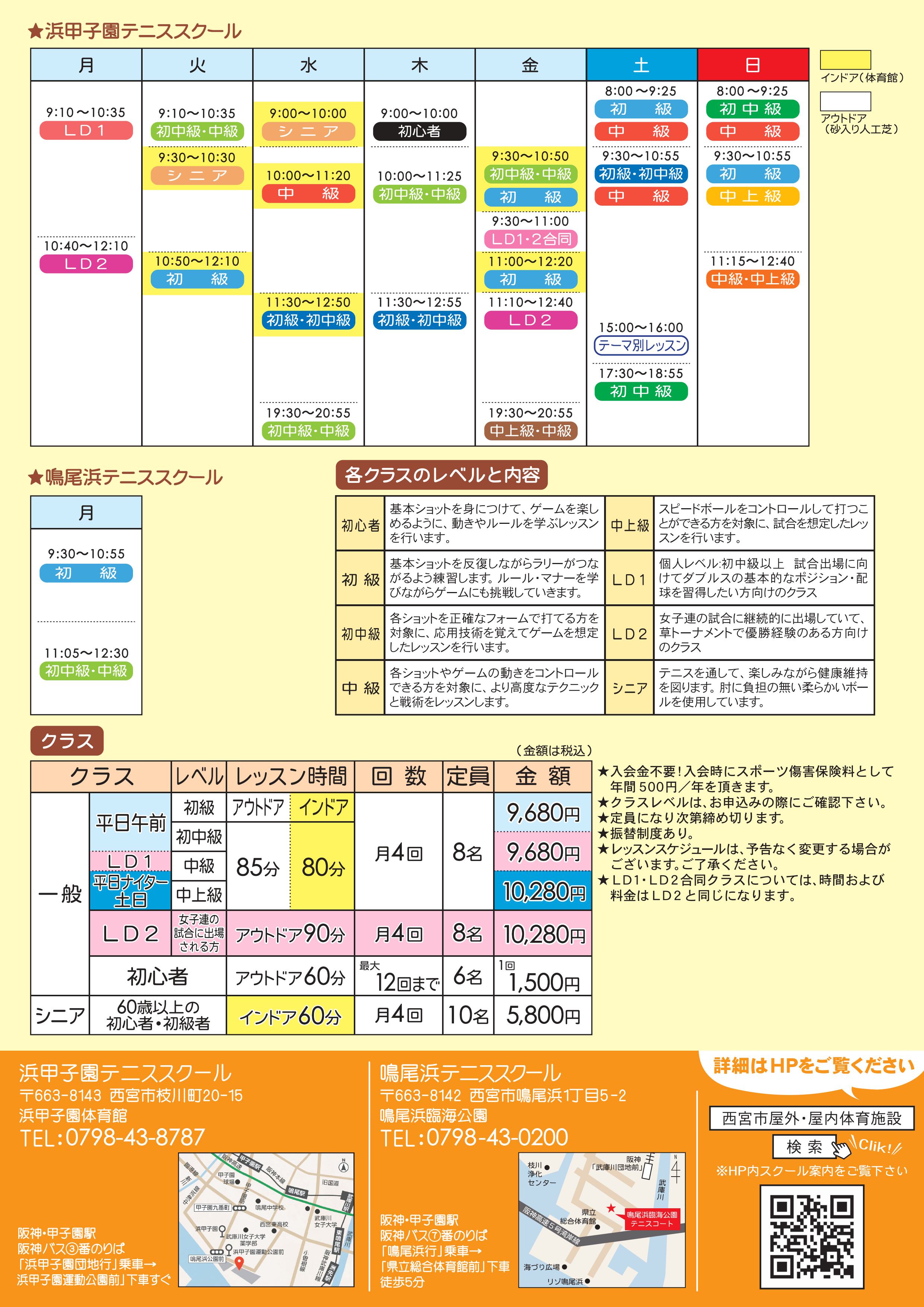 | 参加費用 | 平日昼間クラス 9,680円/月4回(税込) 平日ナイター・土日クラス 10,280円/月4回(税込) LD②(レディースダブルス②) 10,280円/月4回 (税込) LD①②合同クラス 10,280円/月4回 (税込) ※スポーツ傷害保険料:500円/年間(税込) |